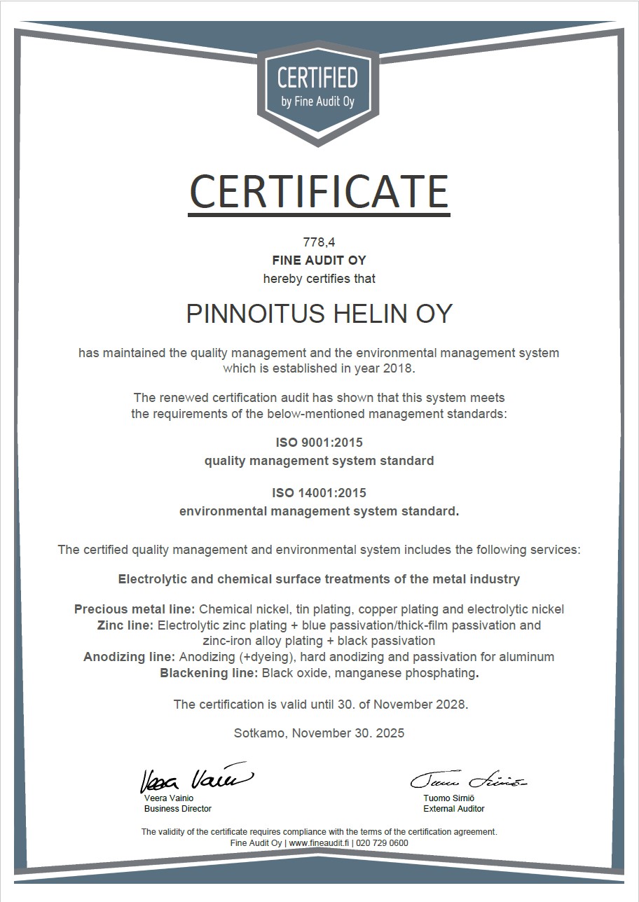 You can download the certificate from this link Pinnoitus Helin Oy ISO 9001:2015 and ISO 14001:2015 certificate